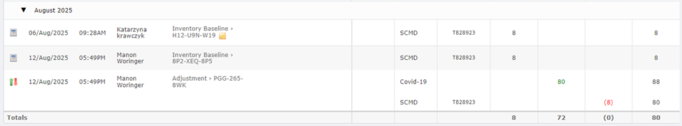 - Type: The type of inventory transaction performed on the product: Inventory Adjustment (IA, via Adjust Stock), Cycle Count (CC), Record Stock (RS), and Inventory Import (II).