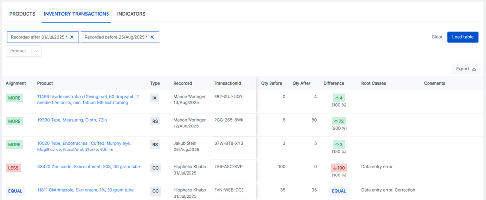 - Alignment: (More/Less/Equal) This column displays if the inventory transaction resulted in an increase, decrease, or change to the product's inventory.