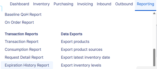 Go to the Reporting Menu>Transaction Reports> Expiration History Report