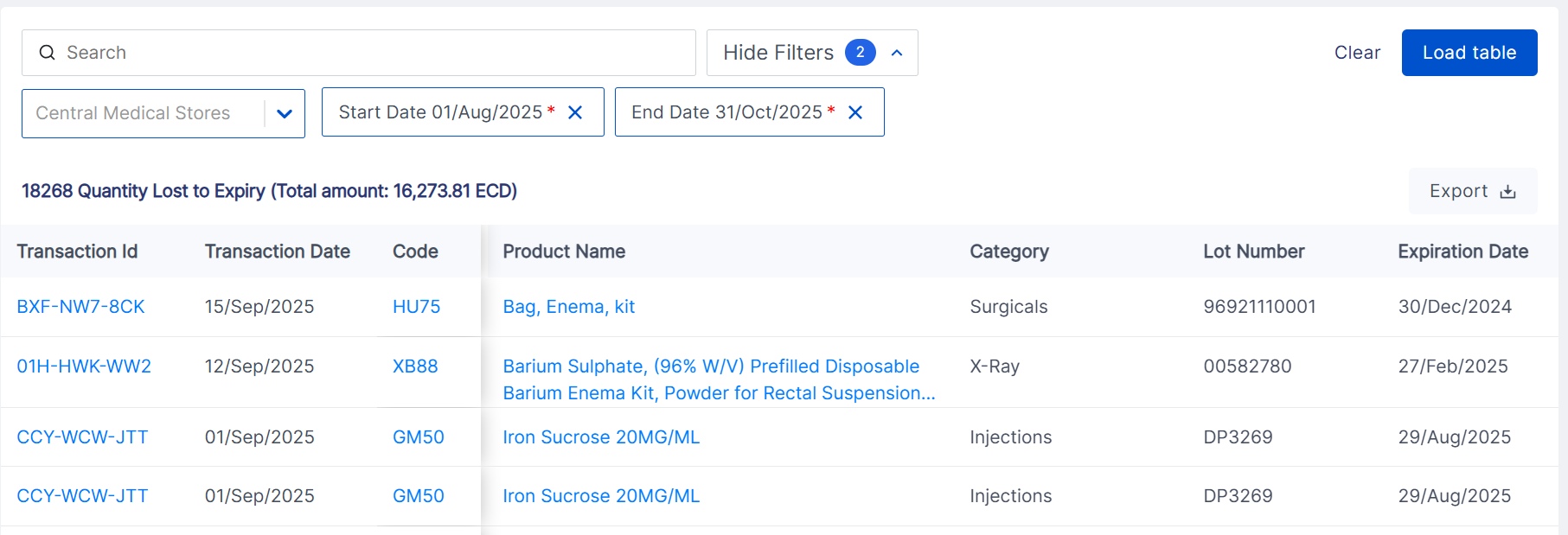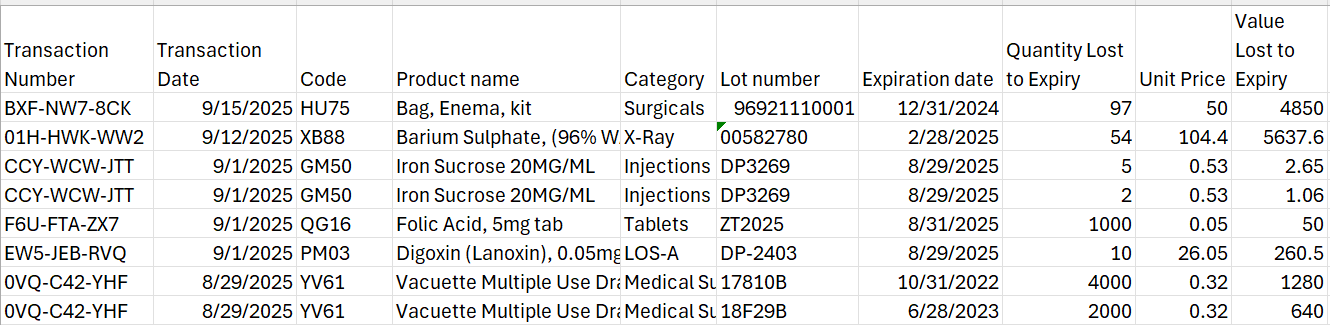 Value lost to expiry: The value of the stock lost to expiry for the given product, lot, and transaction. Calculated as Quantity lost to expiry * Unit Price